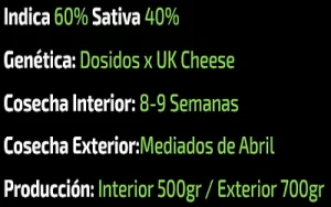 Aroma y sabor: hereda una compleja combinación de aromas y sabores de sus cepas parentales. Puede ofrecer un aroma terroso y ligeramente dulce de la Dosidos, combinado con el característico aroma a queso de la UK Cheese. El perfil aromático puede ser intenso y penetrante, con matices de especias y cítricos que añaden profundidad al sabor.