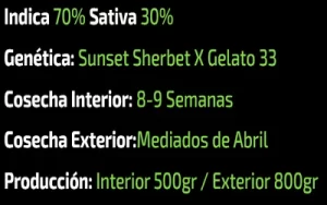 Aroma y sabor: hereda una compleja combinación de aromas y sabores de sus cepas parentales. Puede ofrecer una mezcla de dulzura afrutada y cremosidad de la Gelato 33, combinada con notas cítricas y terrosas de la Sunset Sherbet. El perfil aromático puede ser intenso y dulce, con matices florales y especiados que añaden profundidad al sabor.