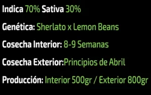 En términos de aroma y sabor, esta cepa ofrece una experiencia sensorial compleja y deliciosa. Hereda los sabores dulces y cremosos de la “Sherlato“, con matices terrosos y herbales, que se combinan con el característico aroma cítrico y limonado de la “Lemon Tree“. El resultado es un perfil de sabor único y refrescante, que puede variar en intensidad según el fenotipo y las condiciones de cultivo.