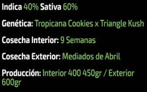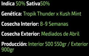 Cada cogollo es una obra maestra de la naturaleza, una sinfonía visual y aromática que encarna la esencia misma de Tropic Thunder. Su aroma embriagador y su sabor exquisito son solo la antesala de la experiencia sensorial que aguarda a aquellos que se aventuran en su mundo. Tropic Thunder no solo promete un viaje alucinante, sino que también brinda una recompensa abundante y gratificante a quienes la cultivan con amor y dedicación. En resumen, esta cepa es un tesoro para los sentidos y un regalo para el alma de todo aquel que tenga el placer de disfrutarla.